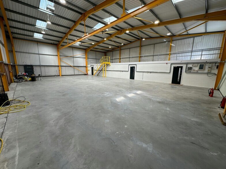 The unit extends to 5,569 sq ft with a ground floor warehouse space of 4,357 sq ft and is of steel portal frame construction, incorporating a secure yard, 6.2 metre minimum eaves height, concrete flooring, and a steel-clad roof. It includes integral office accommodation, a fitted kitchen, and male and female WC facilities, making it well-suited for a range of industrial or distribution uses.