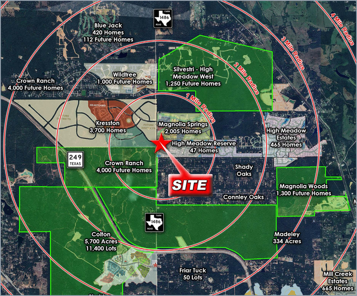 - 2,867 acres situés sur la grande partie nord et sud artère, FM 1486 et Trinity Pines - Situé à l'entrée principale des domaines High Meadow - Environ 427,8 pi de façade sur le FM-1486 - À 3 milles du développement, plus de X maisons qui devraient être construites au cours des cinq prochaines années - 2,5 milles jusqu'à l'autoroute 249/Aggieland - 1,4 milles jusqu'au parcours de golf national Bluejack