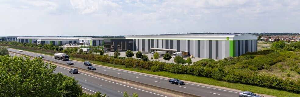 Bedford 97 provides a high-specification industrial/distribution facility totaling 96,336 square feet, positioned prominently along the A421 between the M1 (J13) and A1. The building offers a substantial 89,520-square-foot ground floor warehouse/operational area with 15m clear internal height, a deep 47m yard, 9 dock loading doors and 2 level access doors, supported by dedicated HGV, 98 car, and 60 cycle parking spaces. Sustainability features include an A+ EPC target, full-roof solar PV, smart metering, EV charging infrastructure, and BREEAM Excellent ambition, all within an established logistics park occupied by major brands.