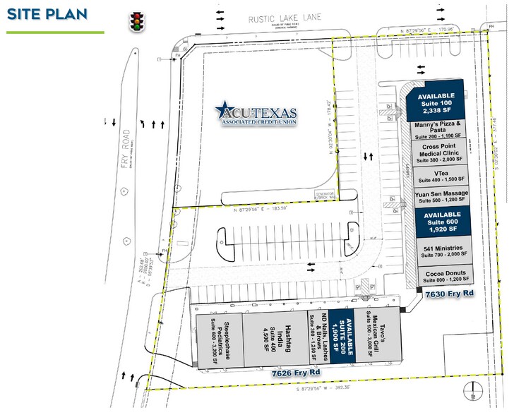 Situé à l'angle sud-ouest des chemins Fry et Rustic Lake Ln, entre FM-529 et Longenbaugh Rd à Cypress, au Texas. La propriété se compose de deux immeubles commerciaux avec façade sur le chemin Fry.