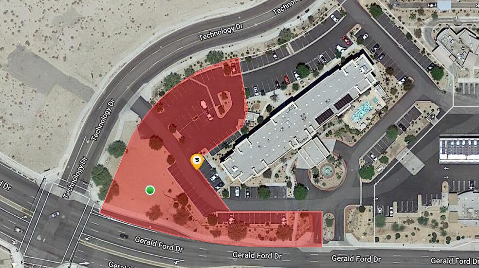 Le terrain est situé dans un centre commercial en pleine croissance où Gerald Ford Drive et Cook Street se rencontrent à Palm Desert. Le quartier est situé près de la nouvelle Acrisure Arena et en face du futur campus de Palm Desert de la California State University. La propriété est entourée du Hampton Inn, Fairfield Inn, un bureau local de DMV, ARCO AMPM, Starbucks et University Village. Le terrain est zoné commercial planifié et comporte deux superpositions, le centre commercial régional (PC-3) et le district de recouvrement commercial Freeway. (FCOZ). Communiquez avec l'agent pour obtenir un lien vers ces utilisations supplémentaires. La Ville appuie la construction d'un restaurant ou d'un immeuble général à bureaux d'une superficie maximale de 5 000 pieds carrés. Un plan précis devra être déposé pour utiliser les espaces de stationnement actuellement utilisés par le Hampton Inn. (Entente partagée.)