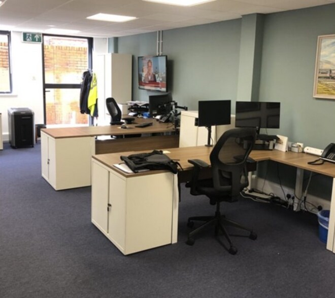 The available ground floor office suite provides approximately 856 sq ft (79.5 sq m) and is accessed via a modern shared reception area. The space benefits from air conditioning and heating, a private meeting room, a fully fitted kitchen, intercom entry system, and access to shared male and female WC facilities. Offered unfurnished on a flexible licence agreement, the all-inclusive rent covers business rates, service charge, buildings insurance, and utilities, with on-site car parking available and Shepperton railway station immediately adjacent.