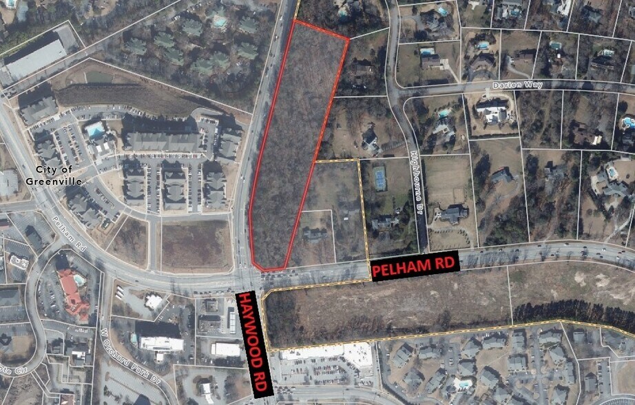 6.71 acres of vacant land at the corner of Haywood Rd and Pelham Rd. Property zoned RH-C in the City of Greenville and is deed restricted to minimum 1.5 acre lots with a maximum of 4 lots. City of Greenville sewer and Metro Connects sewer nearby.