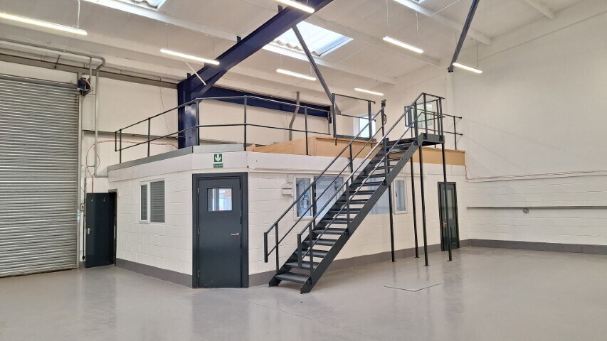 Available space comprises 3,221 sq ft of ground floor warehouse with 552 sq ft of mezzanine space.