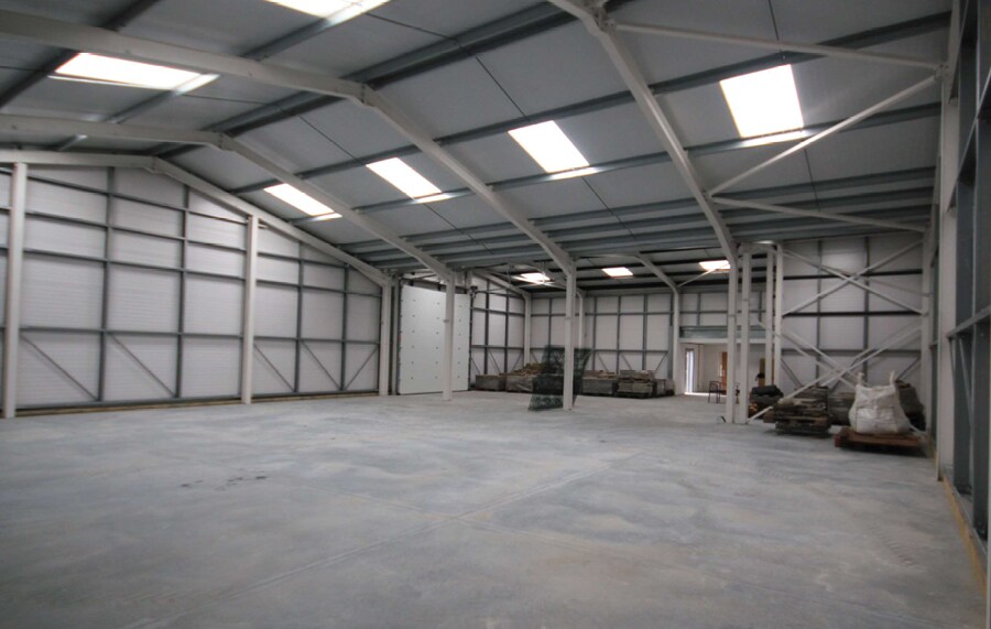 A workshop / warehouse of steel frame construction with lined profiled cladding and roof with roof lights.