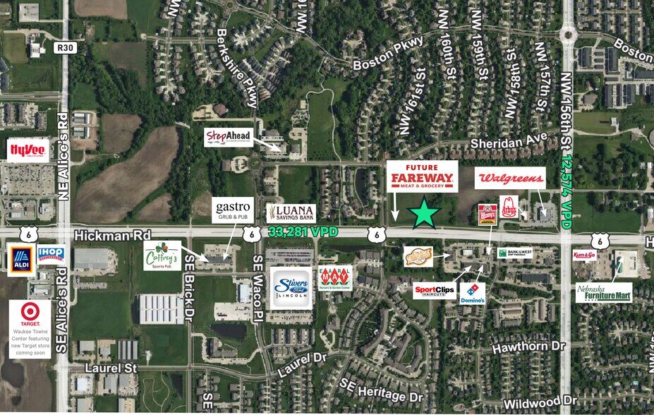 Terrain de 1 à 2 acres au nord du chemin Hickman à Clive avec 33 000 véhicules par jour.
