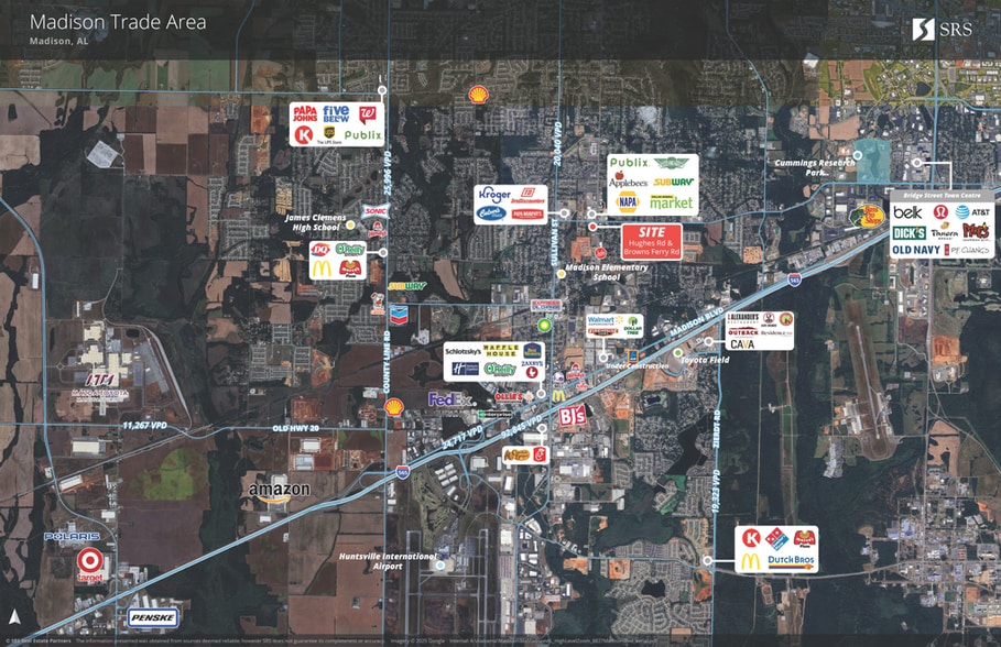 • ±9.7 AC to be subdivided for Ground Lease/Build-to-Suit in the heart of Madison, AL • Dual access from Hughes Road (20,928 VPD) and Browns Ferry Road (16,056 VPD) provides strong connectivity and multiple points of ingress/egress • Surrounded by a highly affluent customer base with average household incomes of $137,980 within 3 miles and $129,207 within 5 miles • Serves a rapidly growing trade area with more than 107,000 residents and over 112,000 daytime population within 5 miles • Located in one of North Alabama’s fastest-growing and most desirable submarkets, ideal for scalable new development