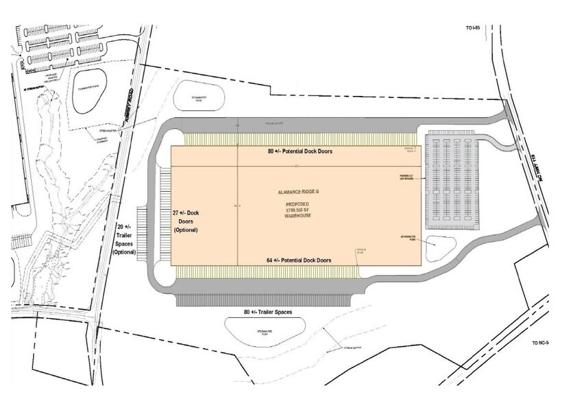 788 550 SF disponibles Bâtiment industriel de catégorie A Édifice Cross-dock Accès immédiat aux I-85 et I-40 Proximité de l'aéroport international de Raleigh-Durham Système de gicleurs ESFR Finition du bureau selon les spécifications du locataire Jusqu'à +/- 427 parcs automobiles Jusqu'à 100 parcs de caravanes Cour de camionnage de 130 pi