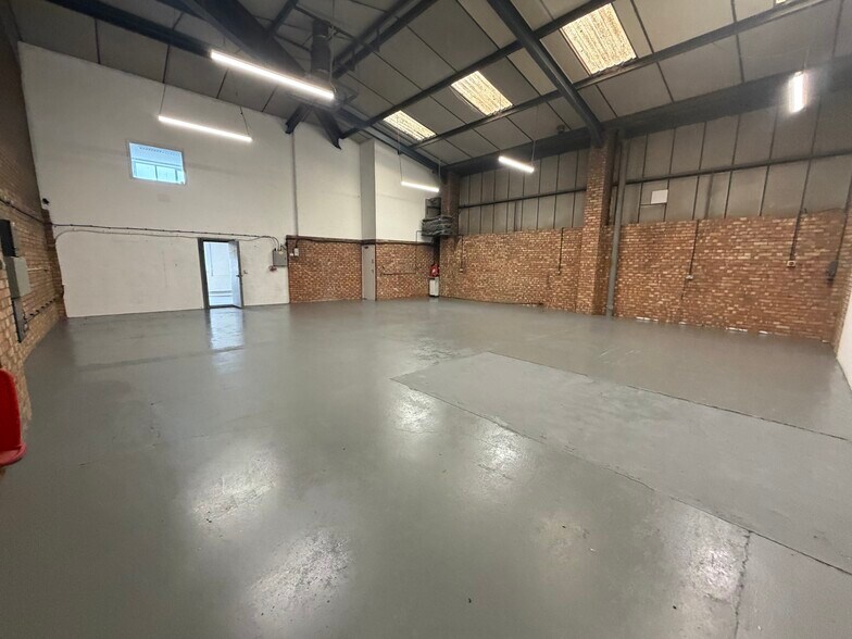 Available to let Light Industrial Unit with First Floor Offices The unit is of steel portal frame construction, with part brick and part profile steel cladding under a pitched roof incorporating translucent roof lights. The warehouse has a minimum eaves height of approx. 4.7m (apex of approx. 5.8m). Accessed via the shared yard area is a manual roller shutter door (approx. 4m height x 2.9m width) which provides access to the warehouse, with internal doors leading to an office / reception area, tea point and WC facilities. A staircase leads to the first floor which comprises two separate offices. The premises benefits from electricity, lighting and gas warm air blower (not tested). There are two additional entrances on the front elevation (double fully glazed personnel doors , and single personnel door), plus an additional personnel door next to the shutter for access / exit. Externally there is a shared concrete yard area providing parking and loading / unloading facilities