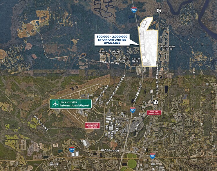 Sur le quadrant nord-est de l'Interstate 95 et du chemin Pecan Park, à trois milles de l'aéroport international de Jacksonville, cet impressionnant parc industriel offrira plus de 6 millions de pieds carrés d'espace à pleine construction. La phase I du développement comprendra deux bâtiments totalisant 2 millions de pieds carrés avec un centre de distribution pouvant atteindre 1,5 million de pieds carrés le long de l'autoroute I-95 et l'autre 500 000 pieds carrés le long de la façade du chemin Pecan Park à l'échangeur de l'autoroute I-95. Ce projet est sur la bonne voie pour que l'approbation du plan du site, les répercussions sur les milieux humides et les mesures d'atténuation soient entièrement approuvées, en place et prêtes pour le début des travaux de construction. L'excellente visibilité sur l'autoroute I-95 ainsi qu'un accès facile à l'aéroport, au port de Jacksonville et au terminal maritime de Dames Point en font un endroit idéal pour les affaires.