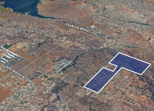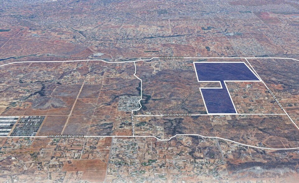 Située au sud-est du lac Mathews, dans le comté de Riverside, cette propriété de 423,68 acres offre intimité et isolement par rapport aux collectivités développées environnantes dans le comté de Riverside en croissance rapide. Le site a une façade le long du chemin Idaleona et s'étend vers le nord jusque dans les collines. Cette propriété est située à environ trois milles au sud du chemin Cajalco. Le chemin Cajalco est une artère importante entre I-15 et I-215. Les collectivités adjacentes au sud et à l'est sont très semblables et sont construites sur 2 à 5 lots CA.
