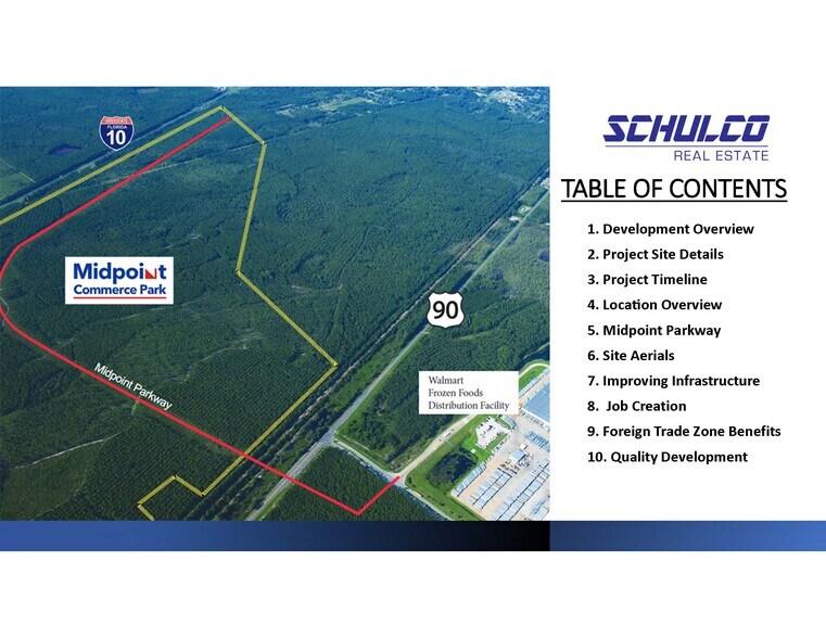 Midpoint Commerce Park est un projet d'aménagement planifié s'étendant sur plus de 3 milles du côté nord de l'I-10, de la ligne du comté de Baker à la sortie 336 (SR-228), dans la ville de Macclenny, en Floride. Le cœur du projet stimulera la croissance de l'emploi dans les secteurs de la fabrication industrielle, de l'entreposage frigorifique et sec et de la distribution. À côté du cœur du projet, il y aura des commerces de première classe, des restaurants, des hôtels, des lieux de bureau/de conférence et des composantes résidentielles pour répondre aux demandes actuelles du marché, mais surtout pour soutenir les emplois que le point médian créera (estimé à plus de 10 000). Cette approche créera un nouveau « centre-ville » dynamique avec un accès facile et pratique à l'autoroute I-10 depuis l'entrée principale du 228. Le site est situé sur la I-10, à l'est de la I-95, qui offre un excellent accès au transport des marchandises qui se déplacent dans toutes les directions par camion, train, automobile et aérien. Plus important encore, le site se trouve à l'ouest de la boucle 295 de Jacksonville, offrant vitesse et efficacité tout en économisant beaucoup de temps en restant à l'écart de la circulation urbaine. Le projet bénéficiera également de la création de Midpoint Parkway, un raccordement prévu de la route 90 à l'Interstate 10 par le Midpoint Commerce Park, qui offrira un accès facile à l'autoroute et réduira la congestion de la circulation des camions au centre-ville de Macclenny. L'accès principal au développement se fera par la voie I-10, au niveau du SR-228, le premier échangeur du comté de Baker Ouest à destination de Jacksonville. Grâce au service ferroviaire disponible, le parc sera en mesure de répondre aux exigences croissantes des entreprises manufacturières et logistiques en matière d'expédition rentable de marchandises. Le service ferroviaire est offert le long de la limite nord du développement le long de l'US-90 et sera fourni par Florida Gulf & Atlantic Railroad, et un service de site conçu sur mesure est offert aux utilisateurs. Les principales installations maritimes du port de Jacksonville se trouvent à 20 minutes à l'est, et les chantiers intermodaux situés à proximité de Florida Gulf & Atlantic Railroad, Norfolk Southern et FEC relieront Midpoint Commerce Park à la distribution entrante et sortante de tous les principaux marchés de la côte Est, du Midwest et des marchés internationaux. Midpoint Commerce Park sera « LE » emplacement à la fin des travaux pour les entreprises qui exigent un excellent accès aux transports, une exposition aux sites interétatiques, une main-d'œuvre de haute qualité et une aide financière disponible de l'État de Floride, du comté de Baker et de la ville de Macclenny. Une fois entièrement aménagé, Midpoint Commerce Park générera une augmentation substantielle des revenus pour la communauté locale et le comté de Baker, ainsi qu'une augmentation considérable pour le développement économique de la région. Walmart, le plus grand détaillant du pays, exploite un centre de distribution de plus de 900 000 pieds SF adjacent à la nouvelle entrée de Midpoint Parkway au large de l'US-90, en plus d'un centre de vente au détail Super Walmart situé en face de l'entrée principale à l'I-10 du SR-228.