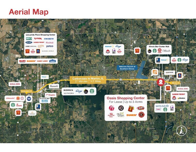 Oasis Shopping Center offers a premier retail leasing opportunity in Marion, Illinois, strategically located along Joseph Cannon Way with immediate access to Highway 13 and less than one mile from the I-57 full diamond interchange. This high-visibility retail destination is designed to accommodate a mix of big-box retailers, small shop spaces, and pad sites, making it ideal for national brands and regional operators seeking a strong presence in Southern Illinois’ fastest-growing commercial corridor. The development is part of the Illinois STAR Bond District, a dynamic hub for retail, dining, and entertainment that attracts visitors from over 70 miles away. The site benefits from exceptional traffic counts, with approximately 32,287 vehicles per day on Highway 13 and 46,555 vehicles per day on I-57, ensuring maximum exposure for tenants.