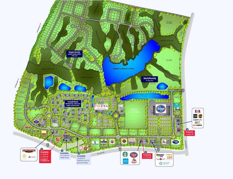 Welcome to Killian’s Crossing (Roberts Branch Parkway) – a 400-acre mixed-use community featuring a variety of retail, dining, residential and healthcare developments. Killian’s Crossing is located less than 15 minutes from downtown Columbia, South Carolina, at the intersection of I-77 and Killian Road (Exit 22) in Northeast Columbia. This development features a blend of residential, retail, and commercial spaces in a walkable, community-focused setting. Retail for Lease (move-in ready) ±1,225 - ±2,500 SF ±1,510 SF ±1,922 SF Planned Neighborhood Retail Center ±13,500 SF retail strip and ±4,000 SF build-to-suit or ground lease Killian’s Crossing is located less than 15 minutes from downtown Columbia, South Carolina, at the intersection of I-77 and Killian Road (Exit 22) in Northeast Columbia. This development features a blend of residential, retail, and commercial spaces in a walkable, community-focused setting.