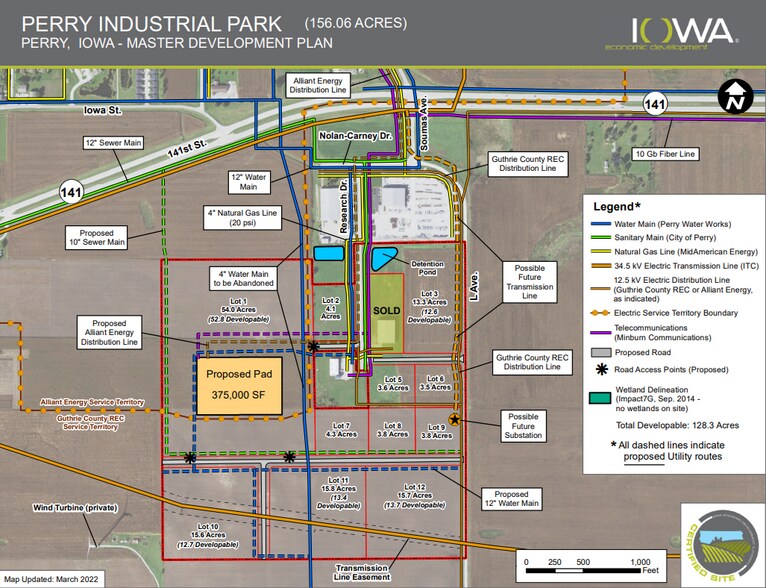 Readily available infrastructure, including a substantial 2 MGW water capacity and 10 MW of power, sewer in the industrial park. Comprehensive due diligence already complete including: phase 1 environmental, endangered species assessment, archeological assessment, wetlands report, and Geotech report are all finalized. over 1 mile from flood plain, and home to a large skilled worker pool. Site is divisible. $75,000/AC