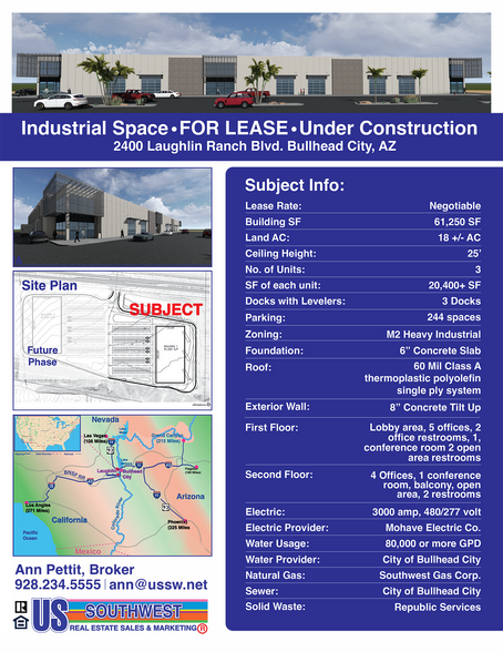 ***EN CONSTRUCTION***Située à Bullhead City, en Arizona, cette prochaine entreprise immobilière commerciale/industrielle offre une occasion de location exceptionnelle dans une région dynamique et dynamique. Avec un futur bâtiment d'une superficie de 61 250 pieds carrés, ce projet est prêt à répondre aux divers besoins d'une entreprise qui cherche à s'implanter stratégiquement dans la région. Divisible en 3 unités - environ 20 000 pi3/s chacune. 20 minutes jusqu'à l'I-40 en Californie, l'emplacement permet une distribution facile à CA, NV et toute la région de la région. Le tronçon de l'I-40 Arizona (corridor ouest de l'I-40) relie l'Arizona à la Californie et au Nouveau-Mexique. Fournit un accès aux attractions touristiques, aux réservations et à d'autres villes de l'Arizona. L'I-40 connaît une augmentation des flux de marchandises, avec des volumes quotidiens moyens de camions allant de 5 800 à 8 100 (données de 2019).