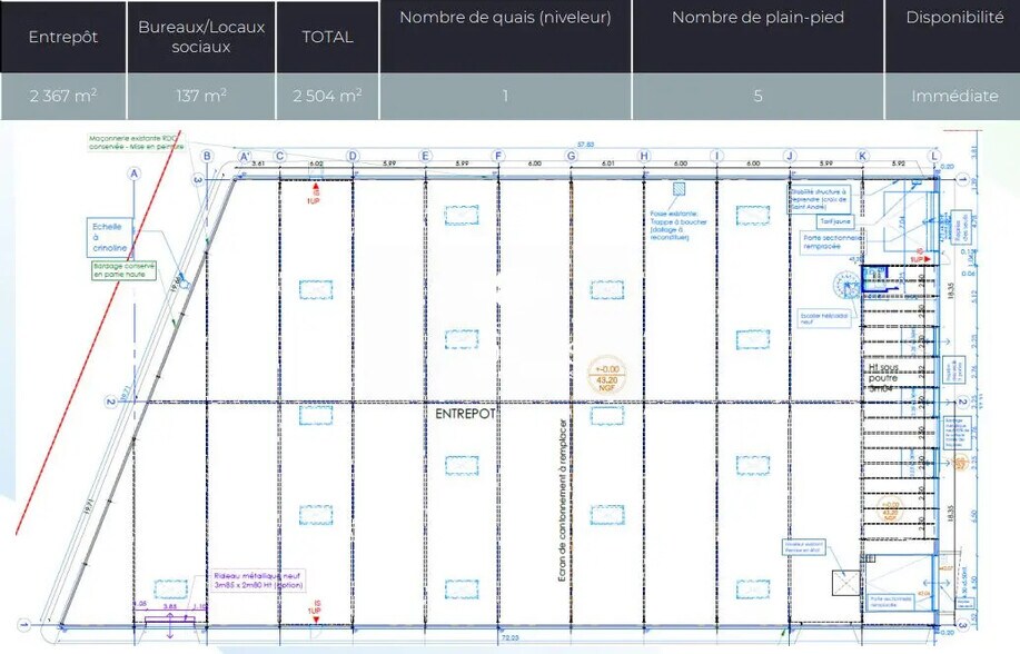 Laetitia LEITAO, consultante en immobilier d'entreprise au sein du cabinet RESEAU BROKERS vous propose à la location un entrepôt indépendant de 2 504 m² situé au coeur de la Zone Industrielle du Coudray,93150 Le Blanc-Mesnil. 2 367 m² d'activité en RDC (HSP 7 m) 137 m² de bureaux / locaux sociaux 1 porte à quai électrique (4,50 x 5,50 m) 3 portes de plain-pied manuelles (2,25 x 2,50 m) 2 portes de plain-pied électriques (4,75 x 4,30 m et 4 x 2,96 m) Équipements : détection incendie, éclairage LED, GTB, chauffage aérothermes (option), climatisation bureaux type VRV, borne électrique, portail manuel. Desserte :Accès immédiat A1 / A3, à 15 km de Paris et 14 km de Roissy CDG Transports : Bus 610 – Gare ligne 16 à 1 km Proximité : Centre commercial O'Parinor Récapitulatif financier :Loyer mensuel : 33 387 € HT HC Charges mensuelles : 1 014 € HT Taxe foncière mensuelle : 2 504 € TBU / TASS mensuel : 92 € HT Montant total mensuel HT : 36?997 € Honoraires preneur : 15% HT du loyer annuel RESEAU BROKERS® est le premier cabinet immobilier d'entreprise structuré en réseau de mandataires. Nous maillons avec notre équipe de 80 Brokers une grande partie du territoire national pour accompagner nos entreprises clientes dans leurs recherches de commerces, bureaux, locaux d'activités, immeubles et fonciers.www.reseau-brokers.com Provision sur charges 1 014 €/mois, régularisation annuelle. Dépôt de garantie 100 161 €. Classe énergie E, Classe climat D. Les informations sur les risques auxquels ce bien est exposé sont disponibles sur le site Géorisques : georisques.gouv.fr. Votre conseiller RESEAU BROKERS® : Laetitia LEITAO Agent commercial (Entreprise individuelle) RSAC 877.765.818