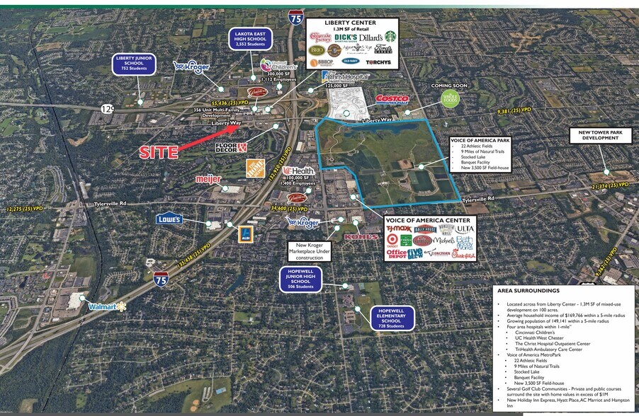 Signalized access to Liberty Center, a 1.3M SF mixed-use lifestyle center home to Dillard’s, Dick’s Sporting Goods, Funny Bone Comedy Club, Cooper’s Hawk Winery & Restaurant, B&B Theatres, AC Hotel by Marriott Cincinnati Liberty Center, The Cheesecake Factory, Kona Grill, iFLY, Shake Shack, Torchy’s Tacos, and Sweetgreen