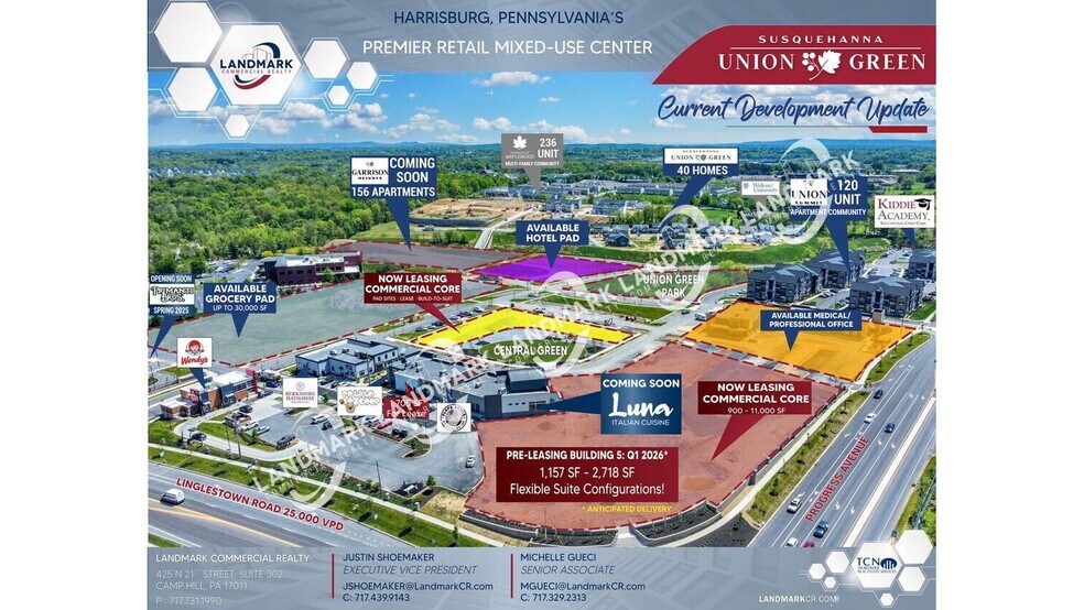 Situé à l'intersection très visible de Linglestown Road et Progress Avenue, Susquehanna Union Green représente la destination phare de Harrisburg pour les projets à usage mixte. Ce centre-ville soigneusement planifié, axé sur les piétons, combine des espaces de vente au détail, de bureaux, d'hôtellerie et résidentiels avec 19 acres de parcs verdoyants et d'équipements communautaires. Au cœur de ce projet, le Bâtiment 5 du noyau commercial offre une opportunité rare de sécuriser un espace dans un corridor dynamique et en pleine croissance, avec des caractéristiques démographiques et une connectivité inégalées. Actuellement en pré-location pour une livraison au premier trimestre 2026, le Bâtiment 5 propose des configurations de suites flexibles allant de petites boutiques à de plus grands espaces, idéales pour les commerces de détail, les bureaux professionnels ou les utilisateurs médicaux. L'architecture met l'accent sur la visibilité et l'accessibilité, avec des plafonds à double hauteur, des vitrines accueillantes et une connectivité intérieure-extérieure fluide vers des cours et patios paysagers. Les locataires bénéficieront d'un environnement piétonnier complété par des co-locataires nationaux tels que Wendy’s, Berkshire Hathaway et Kiddie Academy, ainsi que par de futurs espaces pour épiceries et hôtellerie. L'emplacement se distingue par des caractéristiques démographiques exceptionnelles : un revenu moyen des ménages dépassant 92 000 $ dans un rayon de trois miles et projeté à plus de 110 000 $ d'ici 2025. Avec un accès immédiat aux autoroutes I-81 et I-83, le site est connecté à tous les sous-marchés de Harrisburg et aux pôles régionaux, y compris Hershey, Lancaster et York. Ce cadre dynamique est enrichi par la proximité de pôles commerciaux, de lieux de divertissement et d'institutions éducatives, créant une base de clientèle solide et un attrait pour la main-d'œuvre. Rejoignez une communauté conçue pour la croissance, la commodité et le style de vie—où les affaires prospèrent au cœur de la zone commerciale la plus prisée du centre de la Pennsylvanie.
