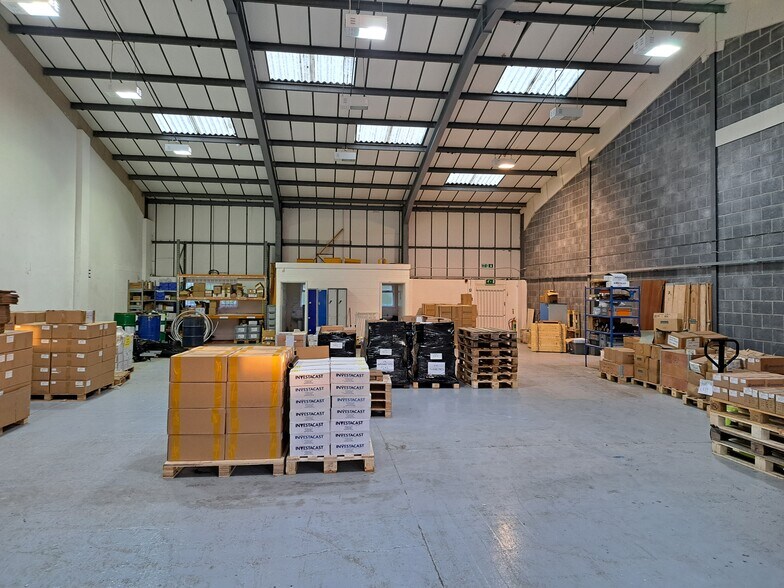 La propriété comprend une unité industrielle légère au milieu de la terrasse à ossature de portique en acier, qui bénéficie d'un toit isolé, d'une grande porte roulante à commande électrique, de trois fenêtres en vPC à double vitrage et d'une porte d'entrée personnel/client menant à l'élévation avant. À l'intérieur, la propriété offre un entrepôt à aire ouverte avec une hauteur minimale d'avant-toit d'environ 4,5 m, un éclairage suspendu et des TOILETTES à l'arrière. La propriété bénéficie également de barres de sécurité aux vitres arrière et aux issues de secours.