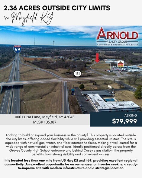 ?? COMMERCIAL OPPORTUNITY | READY TO BUILD ?? ?? 000 Luisa Lane | Graves County, KY ?? MLS #135387 Looking to build or expand your business in the county? This 2.36-acre commercial lot offers the flexibility of being outside city limits while still providing the infrastructure today’s businesses need. This site is already equipped with natural gas, water, and fiber internet hookups, making it ideal for a wide range of commercial or industrial uses. Strategically located directly across from the Graves County High School entrance and behind Casey’s gas station, the property offers strong visibility and easy access. You are less than one mile from US Hwy 121 and I-69, providing excellent regional connectivity for employees, customers, and logistics. To help jumpstart development, the current owner will contribute up to $11,000 in dirt work, significantly reducing upfront costs and accelerating your build timeline. This is an excellent opportunity for an owner-user or investor seeking a ready-to-improve site with modern utilities and a prime location. ?? Don’t miss this one! Opportunities like this in the county are limited. Let’s talk and make this property work for your business. Listed by Ella Burgess, REALTOR® & Drew Harrison, REALTOR® 270.562.1324 /// 270.519.8111
