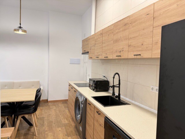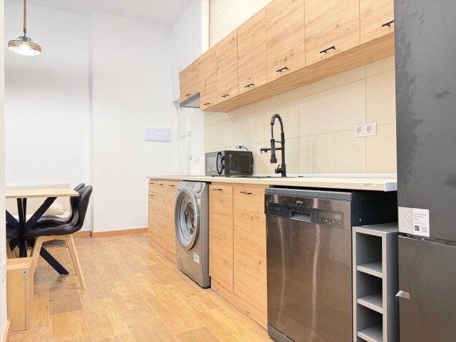 La cocina americana, con aproximadamente 4 metros lineales, está equipada con mobiliario en acabado roble cambrian y negro, e incorpora electrodomésticos como lavadora, frigorífico, microondas, placa de inducción y campana extractora. El baño cuenta con una amplia ducha con rociador superior, mampara de calidad e inodoro con función de ducha bidé.