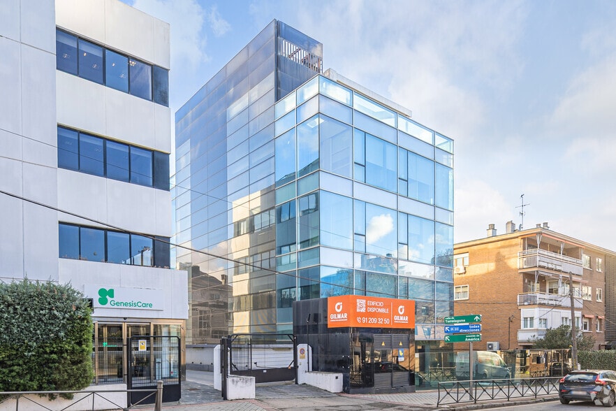 Ref. 24087 Espectacular edificio exclusivo de oficinas de reciente construcción ubicado en una zona inmejorable de Arturo Soria, donde convive entre edificios residenciales, exclusivos de oficinas y excelentes conexiones tanto al aeropuerto como al centro de Madrid, gracias a sus rápidos accesos a la avenida de América. Fachada de cristal que proporciona mucha visibilidad al interior del inmueble. Parking en tres plantas sótano.