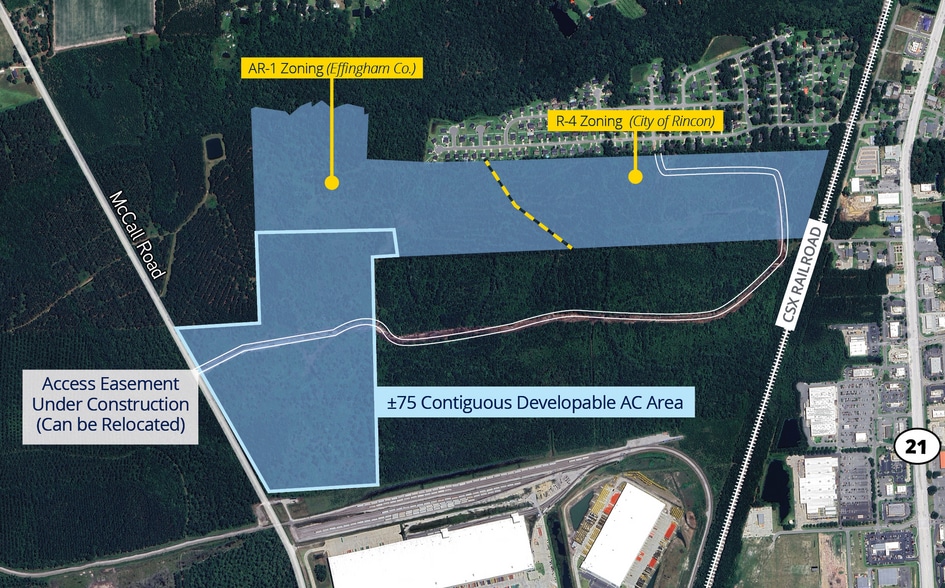 McCall Road Land Tracts offer a rare opportunity to acquire ±193 acres in Rincon, GA—one of the Savannah region’s fastest-growing markets. The site includes ±75 contiguous developable acres, ±101 proposed upland acres, and a City of Rincon–funded access easement currently under construction. Strategically located near Highway 21 with connectivity to I-95, I-16, the Port of Savannah, and Savannah/Hilton Head International Airport, the property sits within a major growth corridor adjacent to the Savannah Gateway Industrial Hub. Zoned AR-1 and R-4 and located in Flood Zone X, the tract provides flexible potential for industrial, multifamily, or residential development.