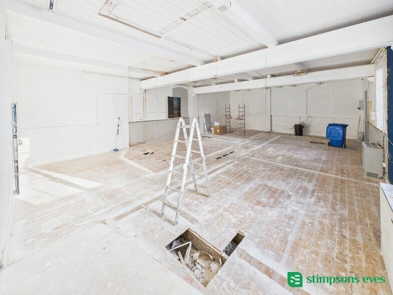 Espace de classe E dans une ancienne salle d'école d'église du 19ème siècle classée Grade II*, aménagée sur deux étages. Le premier étage offre une salle principale voûtée avec des fenêtres en arc, des planchers en bois et une cuisine attenante, tandis que le rez-de-chaussée propose plusieurs pièces adaptées pour le stockage, des bureaux, des salles de traitement ou similaires, avec des installations de WC/douche.