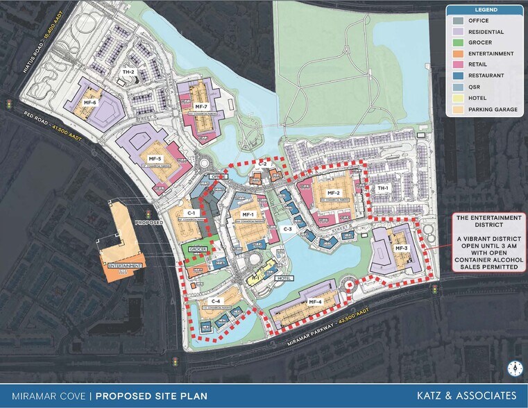 Communauté haut de gamme à usage mixte de 125 acres située à l’intersection de Red Road et Miramar Parkway À un pâté de maisons de la sortie de la Florida Turnpike et à quelques minutes du Hard Rock Stadium, qui accueille plus de 100 événements par an À LA RECHERCHE d’un épicier, de concepts de divertissement, de commerces haut de gamme et de tous types de concepts de restaurants Plus de 2 874 unités résidentielles, un hôtel de 185 chambres et un immeuble de bureaux de classe A de 125 000 pi² Ouverture prévue à l’automne 2028