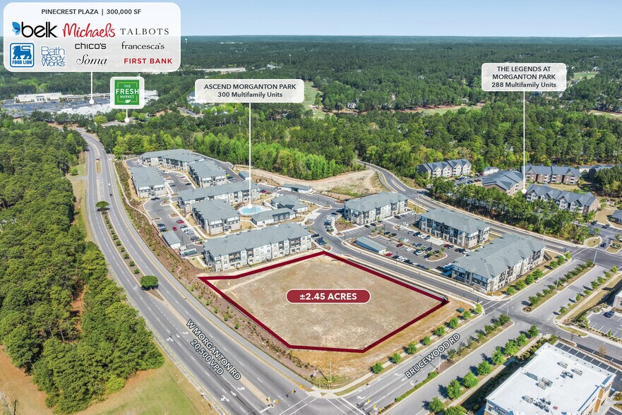 ±2.45-acre pad-ready outparcel Town-supported vision for high-quality, vertical development (2-story encouraged) Ideal for boutique retail and restaurants or marquee position for corporate office location Adjacent to Morganton Park South (Target, Golf Galaxy, national retailers) Immediate proximity to 300+ multifamily units and growing residential base Part of a 116+ acre master-planned mixed-use community Existing stormwater pond Strong tourism and destination demand from Southern Pines & Pinehurst market