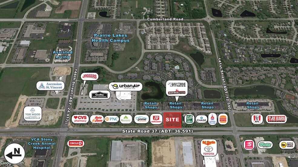 +/- 1,15 Acre. Prêt à être mis au point. Excellente façade le long de la SR 37 et ancrée par de petits magasins et entourée de détaillants solides et de générateurs de trafic