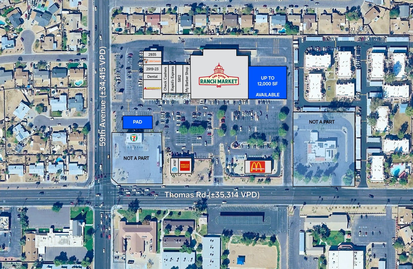 PAD with Drive-Thru available for lease or built to suit. Su Casa Shopping center could be the new home for your business. This well-maintained neighborhood is anchored by Los Altos Ranch Market and is located in a strong Hispanic trade area. National tenants such as Wells Fargo, T- Mobile, Little Caesars and McDonald's occupy the center. Located on the NEC of 59th Ave. & Thomas Road, Phoenix, AZ.