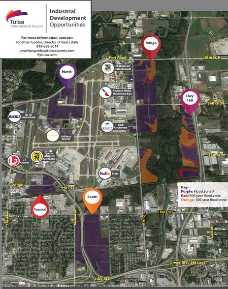 Située aux rues croisées N 74e avenue E et E 34th St N, la zone de développement nord de l'aéroport international de Tulsa comprend ce qui suit : - 168 acres avec accès direct à l'aérodrome. - Tous les services publics sur place. - À moins de deux milles de la route 169 des États-Unis et de la route 11.