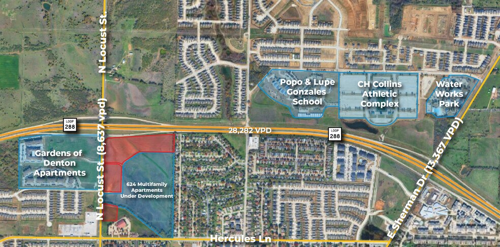 N Locust Street & Loop 288 Tracts (Denton) offer a premier commercial development opportunity on the southeast corner of N. Locust Street (FM 2164) and N Loop 288. The site totals +/- 18.966 AC and is available as three individual tracts (+/- 12.56, +/- 4.33, and +/- 2.075) or as a single purchase. Zoned SC, the property is well-suited for retail, office, or restaurant development and benefits from strong surrounding growth—over 4,000+ multifamily units and thousands of existing and planned homes within a 2-mile radius. With direct Loop 288 frontage and quick access to I-35 (3 minutes) and Hwy 380 (5 minutes), the site provides excellent visibility and connectivity. Additionally, the developer benefits from all utilities, all detention, border roads, mass grading, and a traffic signal at Beall Street provided at no cost, creating a highly competitive and shovel-ready offering.