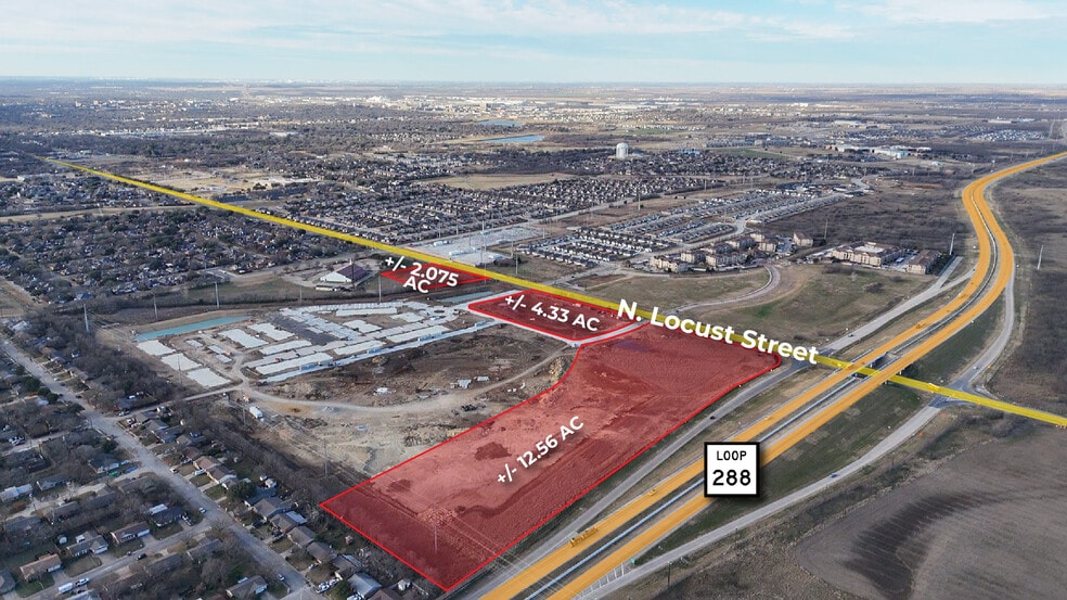 Three separate land tracts available for individual or complete purchase: +/- 12.56 AC, +/- 4.33 AC, and +/-2.075 AC; located on the southeast corner of N. Locust Street (FM 2164) and N Loop 288
