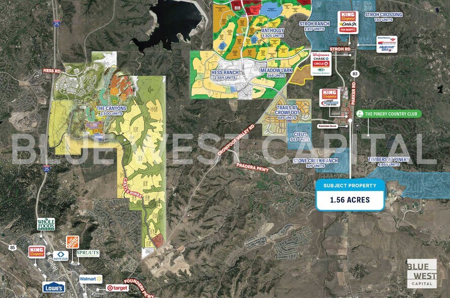 Blue West Capital is pleased to present a 1.56 acre retail pad site located at Parker Road & Pinery Parkway in Parker, Colorado, available for sale, build-to-suit, or ground lease. The site is anchored by a new flagship King Soopers scheduled for delivery in Q4 2026, positioning the property as a premier retail opportunity within one of the Denver metro’s fastest growing and most affluent suburban corridors. Parker Road serves as a major north–south commuter route with 47,000+ vehicles per day, providing exceptional visibility and access. The surrounding trade area features 86,000+ residents within five miles and average household incomes exceeding $198,000, supporting strong long-term retail demand.