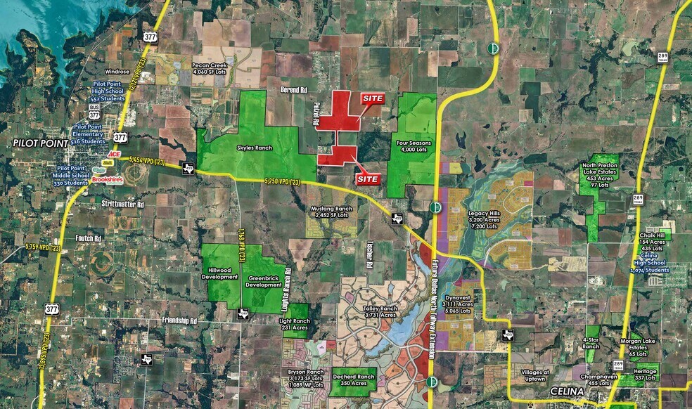 427,5 acres situés à 2,4 km à l'ouest du Dallas North Tollway et à moins de 800 mètres au nord de FM-455. La propriété est idéalement située dans le corridor de croissance rapide entre Pilot Point et Celina, à moins de 8 km de plus de 17 700 lots résidentiels proposés. La propriété en question se compose de deux parcelles : la parcelle 1 couvre 166,7 acres avec 458 mètres de façade sur Pelzel Road, et la parcelle 2 couvre 200,3 acres avec 380 mètres de façade sur Pelzel Road et 492 mètres de façade sur Berend Road. Les deux parcelles sont reliées par une servitude de développement pour les routes et les services publics. Les deux parcelles se trouvent en dehors des limites de la ville de Pilot Point et sont situées dans les limites du district scolaire de Pilot Point (Pilot Point ISD). Le plan actuel des voies de circulation du comté de Denton prévoit que Pelzel Road et Berend Road deviendront des routes principales à 4 voies.