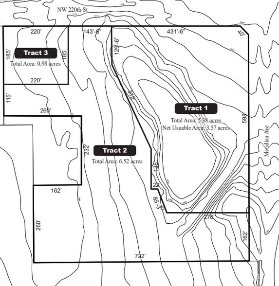 3 999 999 $ - 5,38 acres. Idéal pour une station-service, une banque ou un commerce de détail. **Tract 2** 1 990 000 $ - 6,52 acres. Convient pour une installation de stockage. **Tract 3** 729 000 $ - 0,98 acre. Bureau ou commerce de détail proposé. Peut être vendu ensemble ou séparément. Emplacement idéal à l'angle stratégique de NW 220th Street (Coffee Creek) et Meridian Avenue. À côté de l'école élémentaire Rose Union et des quartiers résidentiels de luxe. Le développement résidentiel Cambridge Estates ajoutera 195 lots/maisons supplémentaires dans la région.