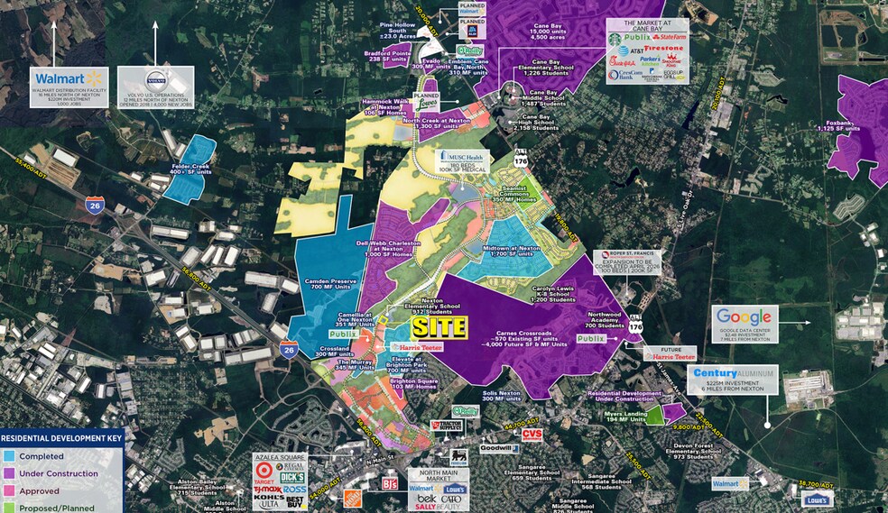 - Le site desservira la communauté de 5 000 acres de Nexton, qui comprend 10 000 maisons unifamiliales, 2 000 unités multifamiliales et 6 millions de PF de com