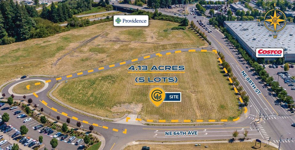 • 4.13 Parcelle commerciale d'un acre composée de cinq lots individuels • Très visible et situé immédiatement de l'autre côté de la rue au nord de Costco et à l'est de l'école secondaire catholique Seton • Zonage commercial général (GC) permettant une grande variété d'utilisations commerciales • À l'angle dur d'une intersection éclairée, près de l'échangeur I-205 /NE Padden Parkway avec les services publics à la limite de la propriété • La 88e rue compte plus de 17 000 déplacements quotidiens