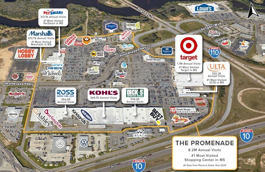 Pad 12 sits next to Target with frontage on Interstate 110. Pad is located on Bobby Eleuterius Blvd which has lighted access to Promenade Pkwy allowing easy access both left hand and right hand turn out. Additionally, the parking area is interconnected to Target and the many other retailers that make up The Promenade. Property has line of sight to Promenade Blvd in addition to parking lot visibility.