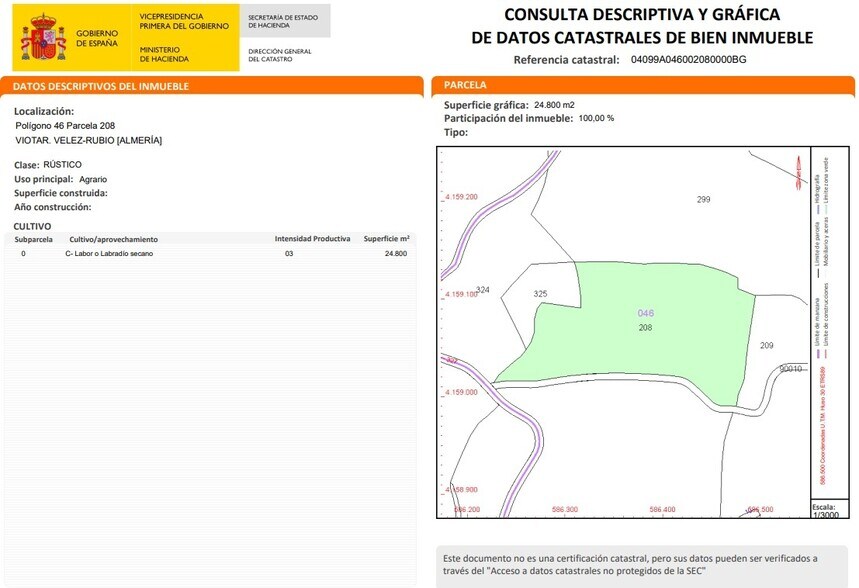 NO COBRAMOS COMISIÓN DE INTERMEDIACIÓN AL COMPRADOR ¡Finca rústica con naturaleza, tradición y una oportunidad única de inversión! Le presentamos una magnífica finca rústica ubicada en la localidad de Vélez-Rubio, un enclave privilegiado en el corazón de la provincia de Almería, donde la naturaleza, la historia y la tranquilidad se funden en un entorno de gran valor paisajístico. La finca ofrece un extenso terreno con gran versatilidad de usos, lo que la convierte en una excelente opción tanto para explotación agropecuaria como para proyectos alternativos vinculados al turismo rural, cada vez más demandado en la zona. La amplitud del espacio permite organizar cultivos de secano, plantaciones adaptadas al clima mediterráneo o incluso espacios de recreo y disfrute familiar. Su orografía y extensión invitan a imaginar múltiples posibilidades: desde la producción agrícola sostenible hasta el desarrollo de un entorno natural de descanso. En cuanto a su ubicación, Vélez-Rubio se caracteriza por un entorno de gran valor patrimonial y natural. El casco histórico, declarado Bien de Interés Cultural, se encuentra a pocos minutos de la finca y dispone de todos los servicios básicos como supermercados, farmacias, colegios y centro de salud. El Hospital Comarcal de Huércal-Overa está a solo 25 minutos en coche, lo que garantiza una cobertura sanitaria de calidad. Además, la finca goza de buenas comunicaciones por carretera a través de la autovía A-92N, que conecta con Granada y Murcia, y de fácil acceso hacia la costa almeriense en aproximadamente una hora. Hipoges es una plataforma inmobiliaria donde podrás acceder a miles de activos inmobiliarios de diferentes tipos como viviendas, locales comerciales, terrenos, nueva obra, tanto a nivel particular como para inversores. Hipoges cuenta con una amplia cartera de activos inmuebles tanto en España como en Portugal y Grecia.