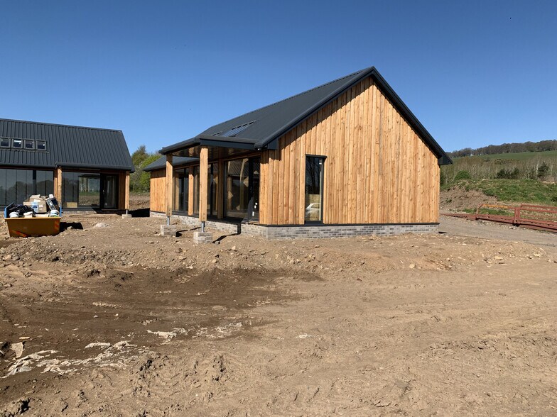 The properties are of timber frame construction, timber clad externally and with pitched profile metal sheet roof over. Each of the units has a glazed frontage with velux roof windows.