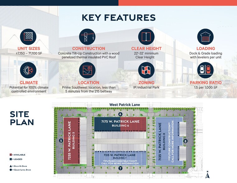 Bienvenue à Mountain West Industrial Park Phase II, un parc industriel à la fine pointe de la technologie conçu pour répondre aux besoins des entreprises modernes du marché de Las Vegas. Stratégiquement située sur W. Patrick Lane et S. Tenaya Way, cette installation industrielle de premier ordre offre un accès inégalé aux principales autoroutes (I-215/I-15) et se trouve à moins d'une journée de route par camion de la Californie, de l'Arizona, de l'Utah, de l'Idaho, de l'Oregon, de Washington, du Wyoming, du Montana et du Nouveau-Mexique. Pour plus d'informations, communiquez avec Lauren Willmore au 702-369-4825 ou par courriel à lauren.willmore@cbre.com. Principales caractéristiques du parc industriel de Mountain West, phase II : Emplacement privilégié : Positionné à quelques minutes de l'échangeur I-215/I-15, à moins de 15 minutes de l'aéroport international McCarran. Options d'espace flexible : Le parc comprend une variété de tailles et de configurations d'unités, allant de 7 150 à 110 304 pi2 pour répondre à diverses exigences opérationnelles. Zoné pour la polyvalence : Le projet est un parc industriel zoné (PI) dans la juridiction du comté de Clark, qui permet une variété d'utilisations industrielles, y compris la fabrication légère, l'entrepôt et la R-D.