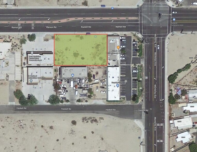 Trois terrains vacants totalisant 0,43 AC près de l'intersection du chemin Ramon et de l'avenue Monterey. L'électricité IID est sur le terrain, l'eau et le gaz sont dans la rue. À l'heure actuelle, il n'y a pas de conduites d'égout dans la zone, de sorte que les propriétés doivent utiliser une fosse septique.