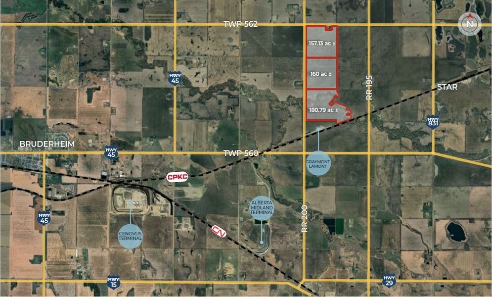 ADRESSE MUNICIPALE RR 200 & TWP 562, Comté de Lamont, AB DESCRIPTION LÉGALE 4; 19; 56; 7; NO (parcelle 1), 4; 19; 56; 7; SO (parcelle 2), 9221690; 1 (parcelle 3) ZONAGE HHI (Heartland Heavy Industrial) Parcelle 1 157,13 acres ± Parcelle 2 160,00 acres ± Parcelle 3 180,79 acres ± TAILLE TOTALE DU SITE 497,92 acres ± PRIX DE VENTE Marché POSSESSION Négociable