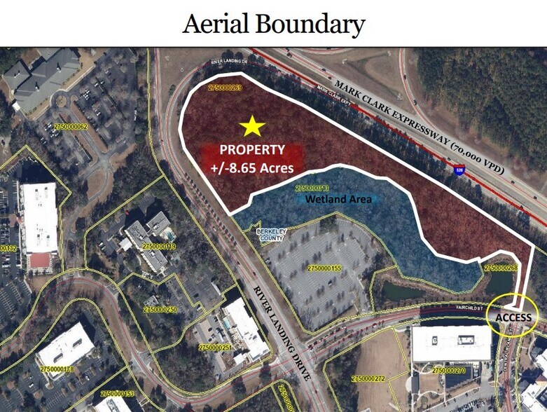 Cette propriété à un positionnement unique s'étend sur +/- 8,65 acres de terrain commercial boisé et admissible avec une façade importante sur l'Interstate 526 (+/- 67 000 VPM) et est l'une des dernières parcelles non aménagées restantes de l'île Daniel. La parcelle est subdivisée, est couverte par une détermination de milieu humide existante et bénéficie d'un accès direct à partir de la rue Fairchild.