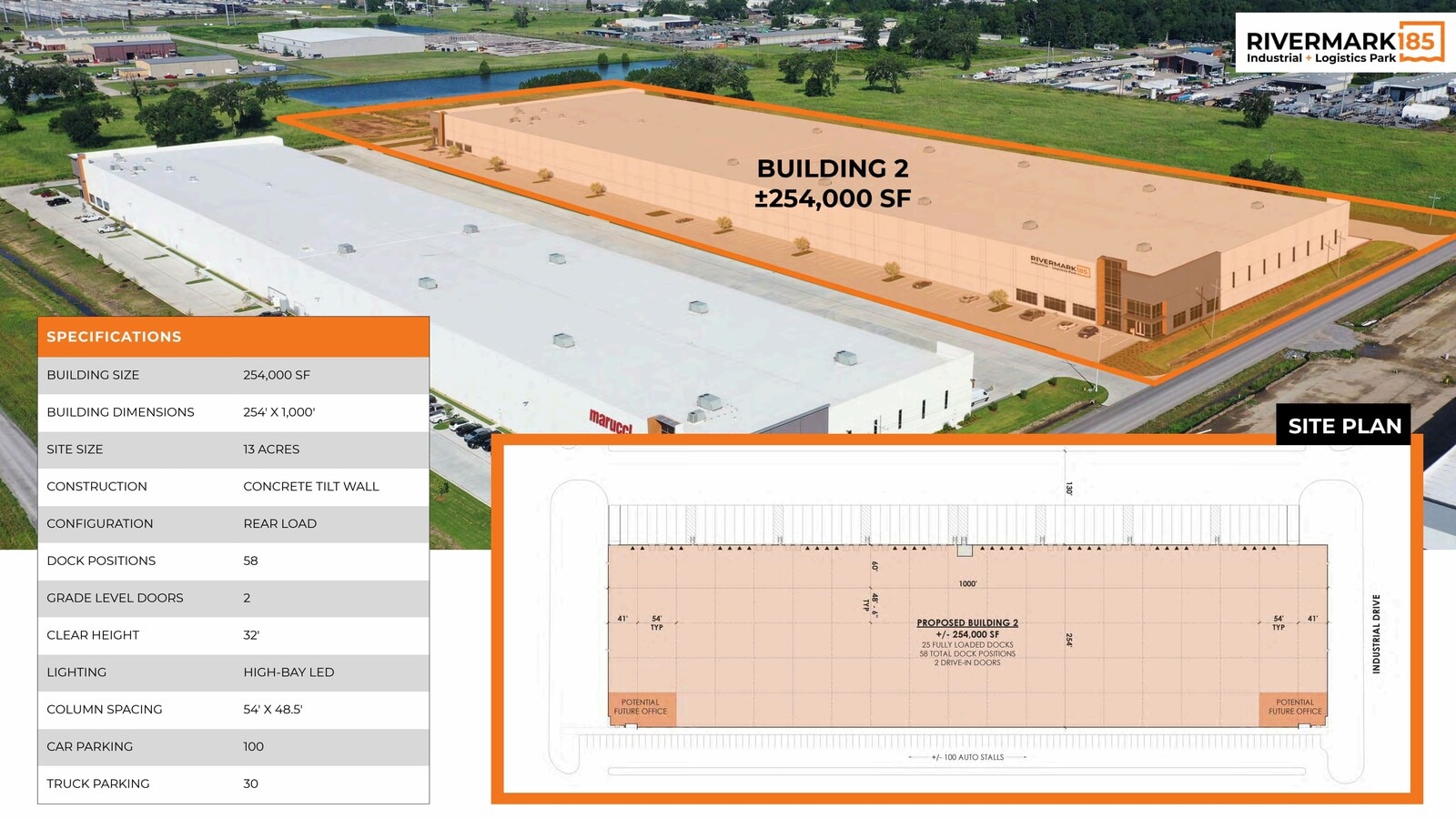Le parc industriel et logistique RIVERMARK 185 est un site de 96 acres entièrement autorisé, en cours d'aménagement. Le parc industriel et logistique RIVERMARK 185, situé à côté de la ligne de 185e milles longeant le fleuve Mississippi, comprendra plus de 1,0 million de pieds carrés de mur inclinable de classe A, d'entrepôt et d'espace de distribution. Situé juste à l'est de l'intersection de la route 73 et de l'autoroute 30 le long de la promenade Industrial à Geismar, en Louisianie, le développement se trouve à moins de deux milles de l'Interstate 10. La première phase du projet débutera en février 2023 avec une installation de murs inclinables en béton à chargement arrière de 200 000 pieds carrés, dont l'achèvement est prévu au début du quatrième trimestre de 2023. Avec une hauteur libre de 32 pi, un espacement des colonnes de 54 pi x 46 pi, une profondeur de baie de 200 pi, 40 portes de quai, des gicleurs ESFR et un éclairage à DEL haute baie, le bâtiment 1 de RIVERMARK 185 sera inégalé sur le marché des entrepôts de Baton Rouge. En décembre 2022, il a été annoncé que Marucci Sports occupera 100 000 SF du bâtiment 1, laissant 100 000 SF disponibles à la location. Les phases futures ont la souplesse nécessaire pour répondre à la demande du marché. Le site est d'une taille suffisante pour accueillir jusqu'à 600 000 pi2 à locataire unique, une installation à quai transversal, plusieurs installations de chargement avant ou arrière de 200 000 pieds carrés, un seul locataire, une installation de 200 000+/- SF avec plus de 10 acres de cour extérieure, sécurisée et stabilisée. RIVERMARK 185 offre une disponibilité des infrastructures et une accessibilité des transports inégalées sur le marché régional. À moins de 1 000 pieds d'une sous-station électrique desservie par Entergy, ce site offre une capacité importante pour les projets ayant des besoins importants en énergie.