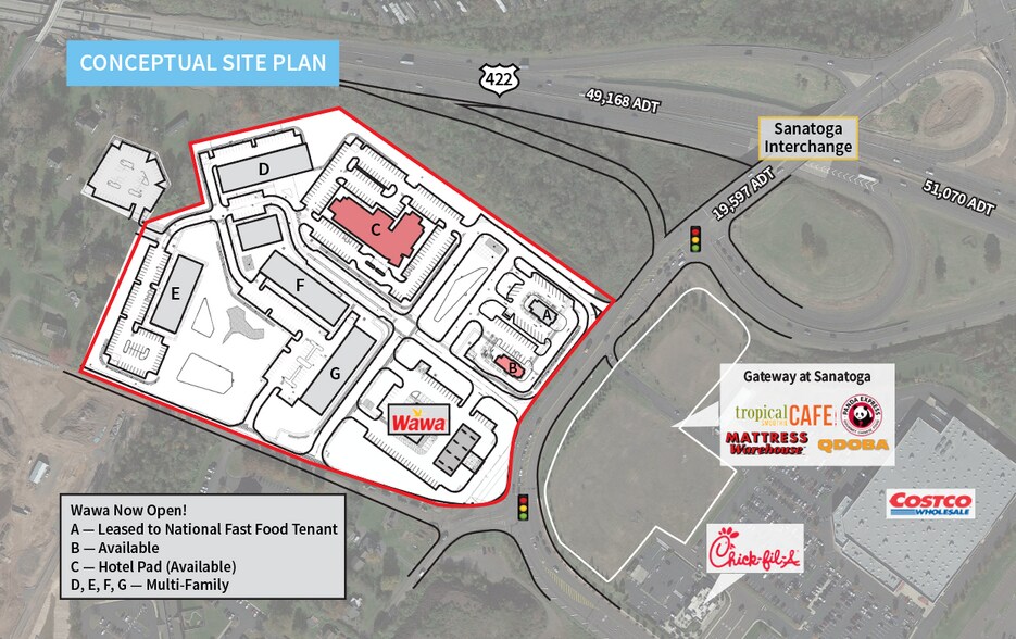 • Bientôt disponible : développement à usage mixte de 24 acres et plus comprenant Wawa et une résidence multifamiliale • Pads disponibles pour le commerce de détail, le restaurant et l'hôtel • Immédiatement après la sortie de la route 422 pour le Philadelphia Premium Outlets (549 000 SF de détail) • Directement en face de Costco et Chick-Fil-A • Adjacent à des centaines de nouvelles maisons de ville et d'appartements, et plus de 1 000 autres logements proposés à proximité • Adjacent à l'hôpital proposé